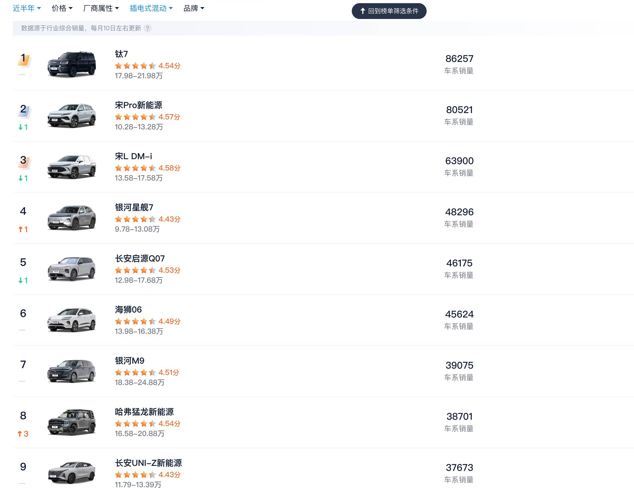 На современном рынке подключаемых гибридных внедорожников стоимостью около 150 000 юаней, BYD Song Pro DM-i стабильно демонстрирует ежемесячные продажи более 10 000 единиц в течение последнего года, при этом пиковые ежемесячные продажи превышают 20 000 единиц. Changan Qiyuan Q07 также прорвал доминирование BYD благодаря своей экономичности, поддерживая стабильные ежемесячные продажи на уровне около 10 000 единиц.